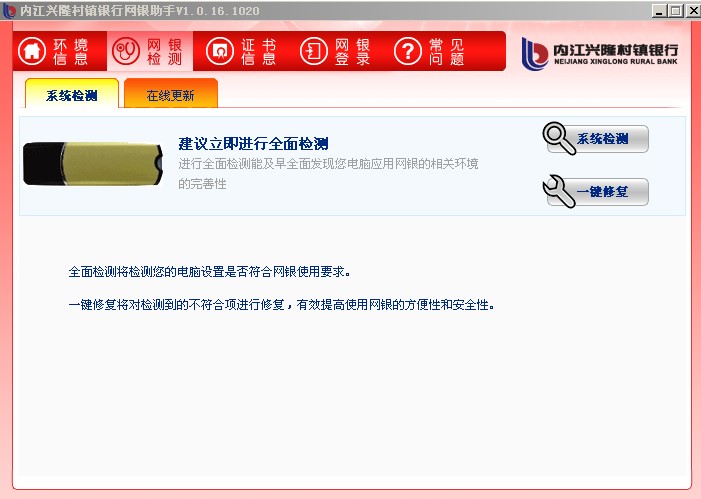 2.下载并保存网银助手, 运行安装网银助手,然后打开网银助手点击一键修复,如下图:
