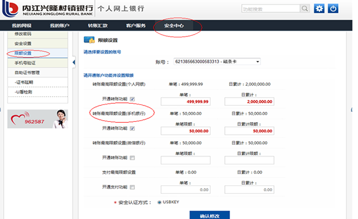 2、客户通过手机客户端申请开通手机银行,仅有查询功能。如需开通转账及其他功能,客户需要携带本人有效身份证件前往营业网点进行办理;已开通网上银行的客户,也可通过个人网银客户端,点击“安全中心”->“限额设置”,进行手机银行转账权限开通。