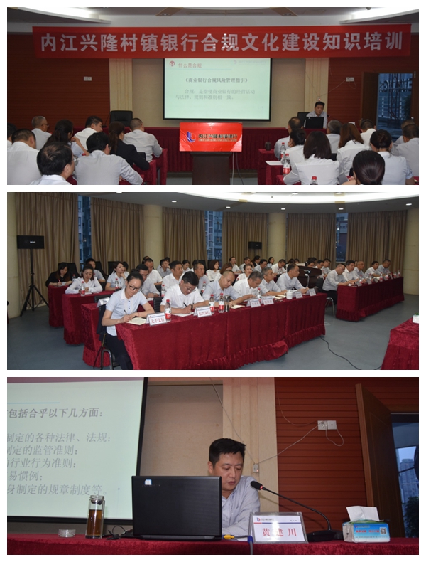 为贯彻落实《四川银监局关于开展银行业“三年合规文化建设行动方案”的通知》及“内江兴隆村镇银行三年合规文化建设行动方案”要求,进一步提升我行合规文化建设水平,2018年9月12日,内江兴隆村镇银行在本行四楼会议室举行了由黄建川董事长主讲 “加强合规管理,护航兴隆发展”的合规培训会。总行行领导、各支行班子成员、全行高级副经理以上管理人员46人参加了此次培训。